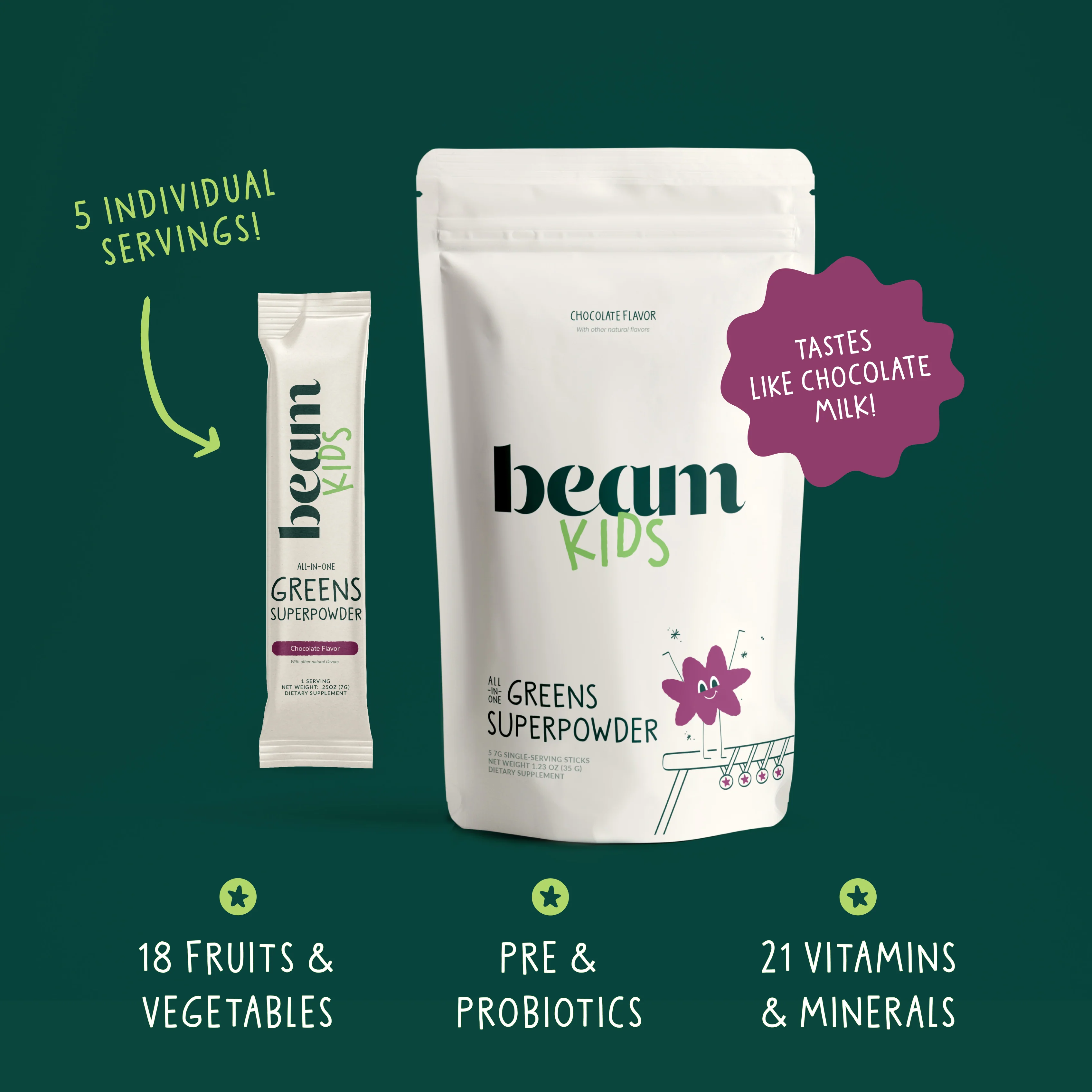 Beam Kids Chocolate All-In-One Superpowder, now available in a convenient 5-serving travel pack!! Co-created with Shawn Johnson, this pediatrician-approved blend features essential ingredients to support growth, immunity, and gut health—all in a delicious chocolatey flavor kids love.